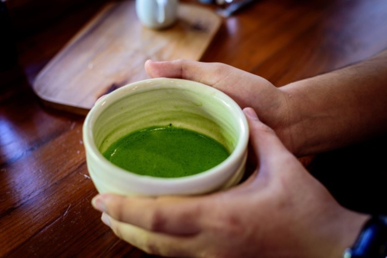 抹茶碗をお湯で温めます。茶筅もお湯で温めることで、しなやかになり点てやすく、また傷みにくくなります。抹茶を茶杓一杯半(1.5g~2g)抹茶碗に入れます。このとき、篩(ふるい)や茶こしなどで、ふるうとダマになりにくく点てやすくなります。